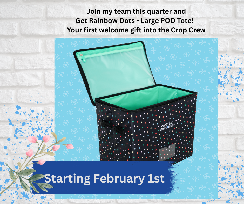Join my team this quarter and get your Rainbow Dots POD Tote. Your first welcome gift into the Crop Crew.