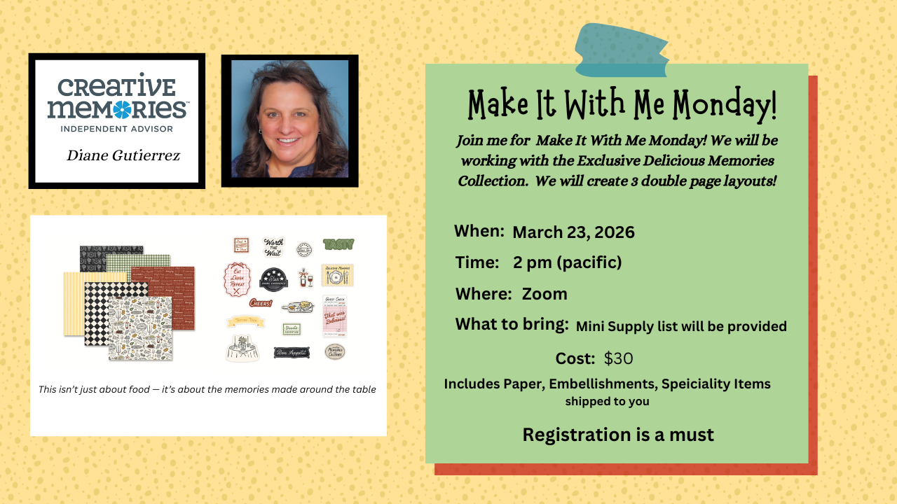 This 3 hour Zoom Crop is for all my Customers and Team Members. For more information on how to join this community, email me cmscrapbookingwithdiane@gmail.com
